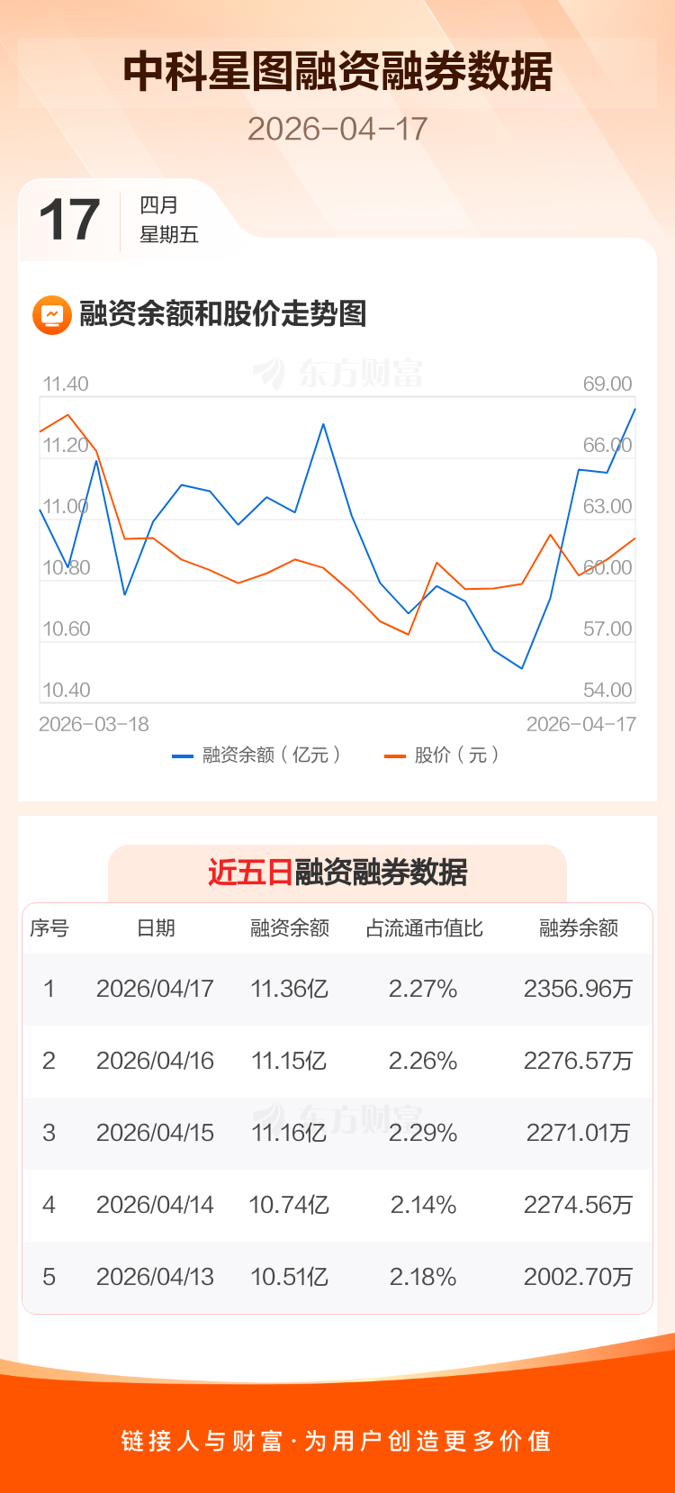 交易所最新数据显示,中科星图于2026年4月17日获融资买入9193.94万元,融资偿还7093.91万元,当日融资净买入2100.03万元。目前,该股融资余额11.36亿,占流通市值比例为2.27%。