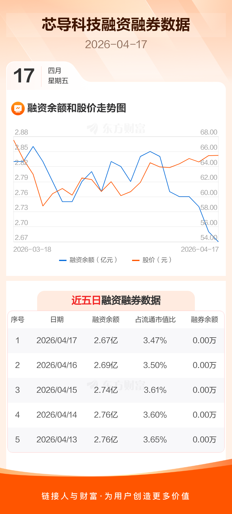 交易所最新数据显示,芯导科技于2026年4月17日获融资买入522.98万元,融资偿还712.39万元,当日融资净偿还189.4万元。目前,该股融资余额2.67亿,占流通市值比例为3.47%。