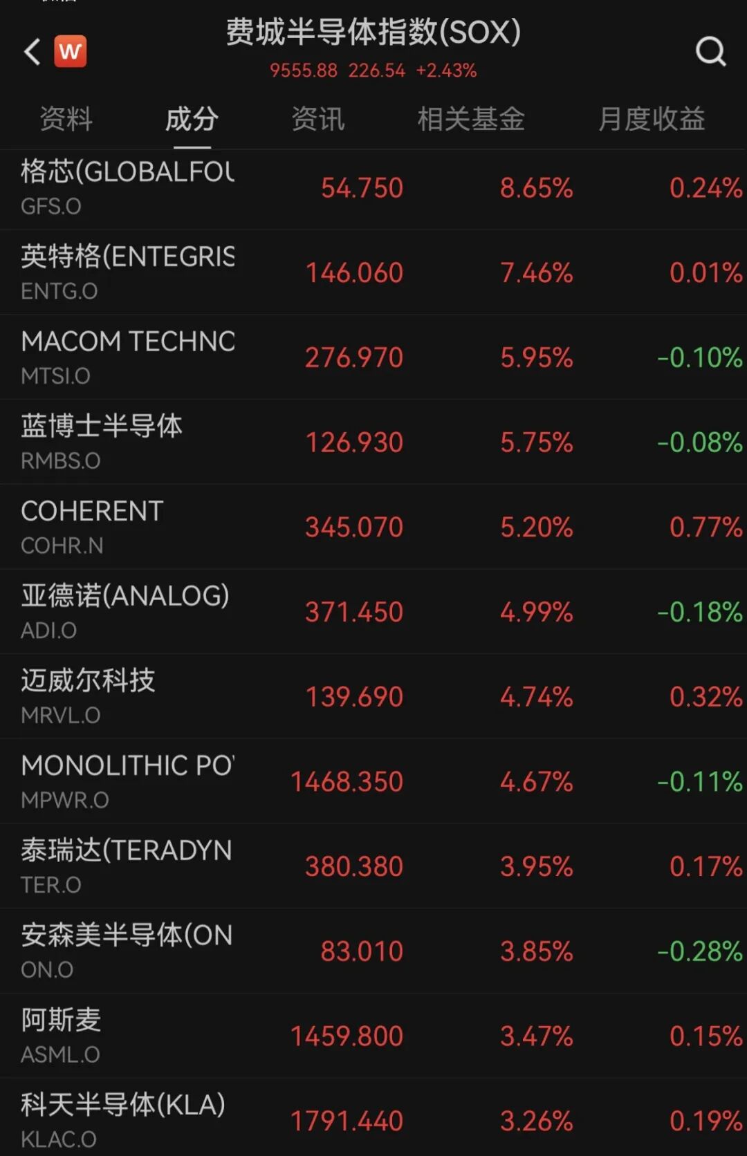 芯片股表现强势,费城半导体指数上涨2.43%。格芯大涨超8%,英特格涨超7%,蓝博士半导体、迈威尔科技、阿斯麦等跟涨。