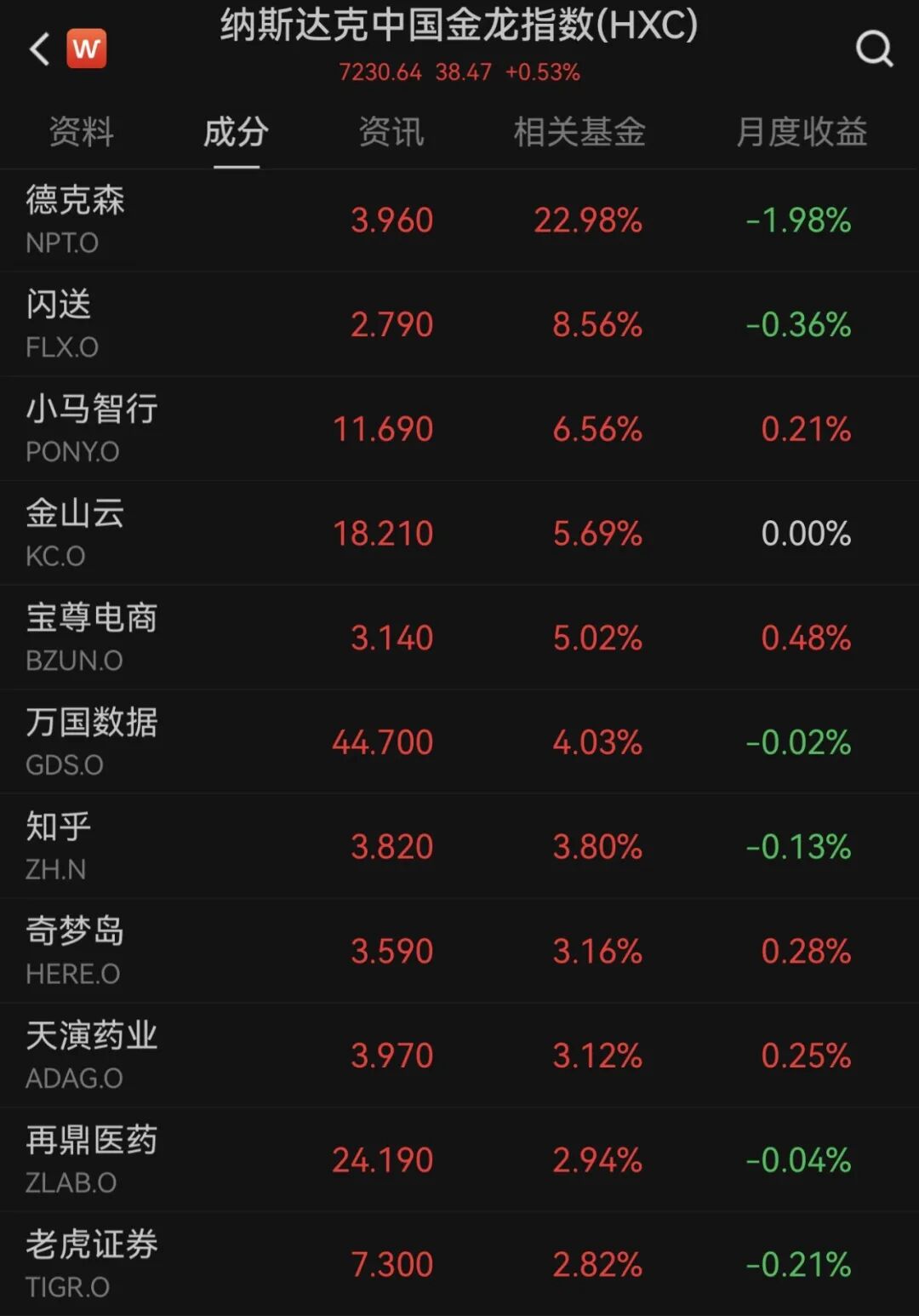 中概股方面,纳斯达克中国金龙指数涨0.53%。德克森涨近23%,闪送涨超8%,小马智行涨超6%,金山云、宝尊电商涨超5%。