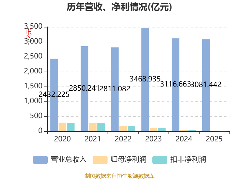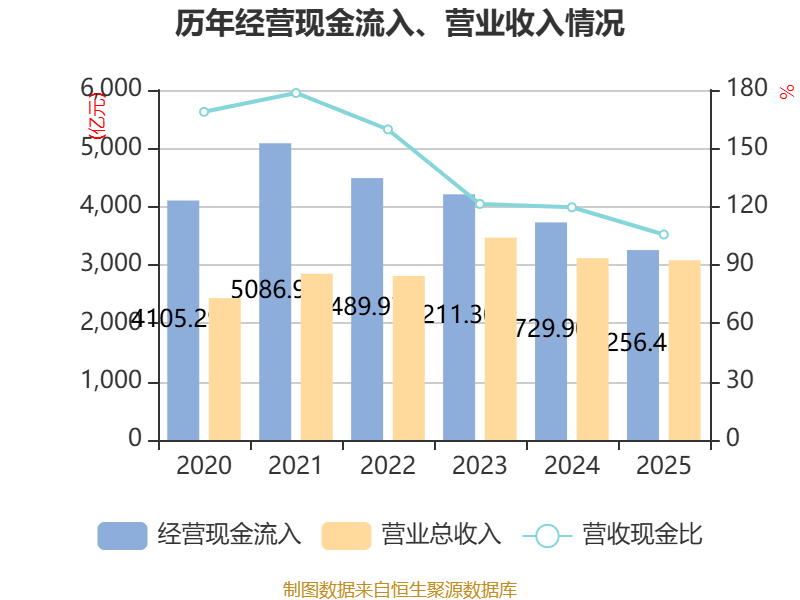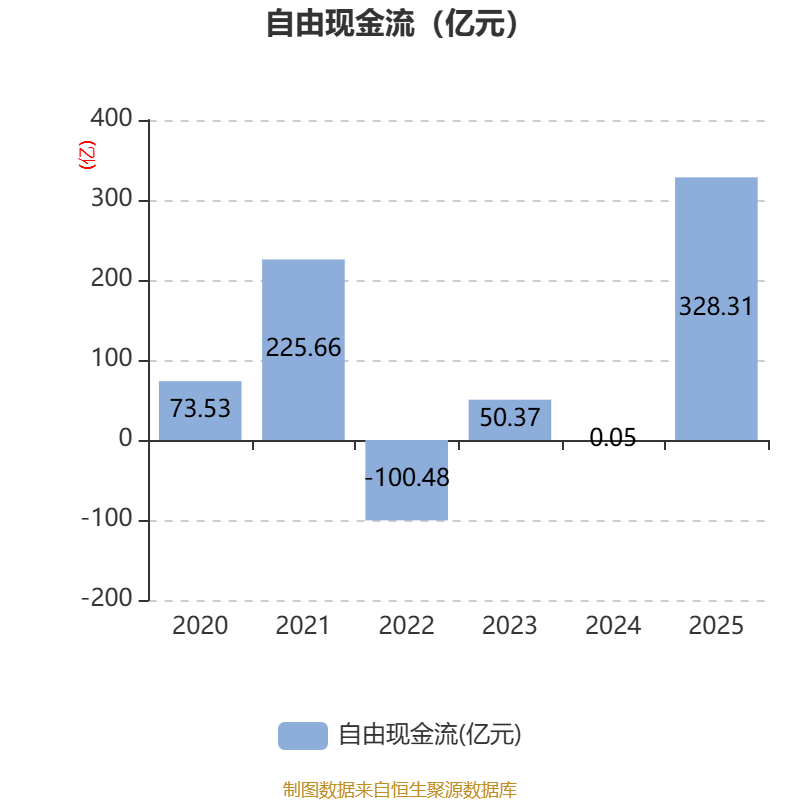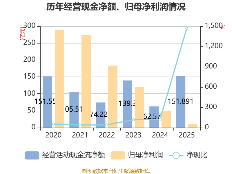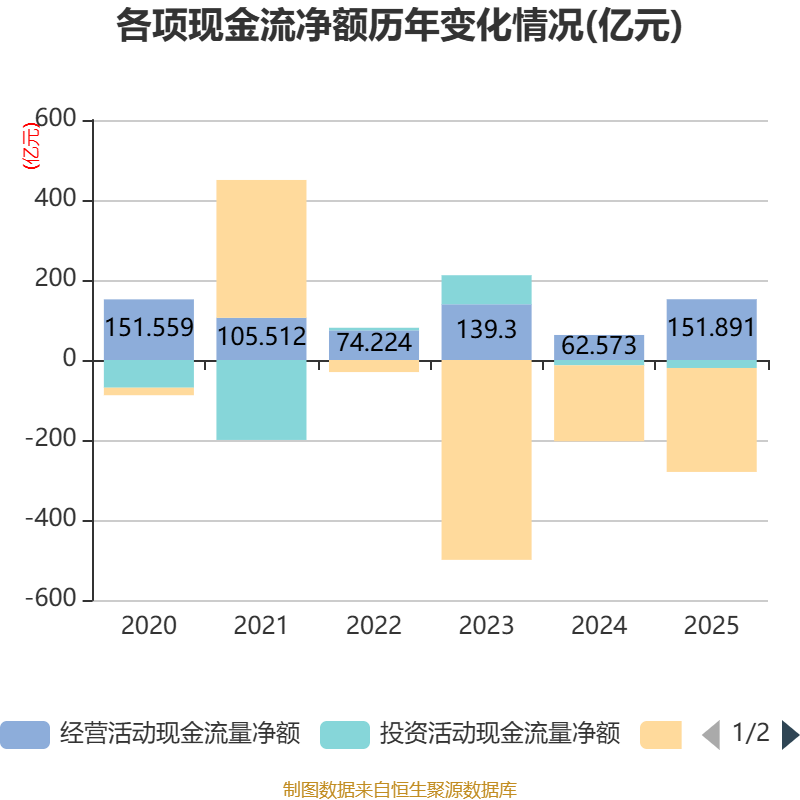 截至2025年,公司经营活动现金流净额为151.89亿元,同比增长142.74%;筹资活动现金流净额-259.83亿元,同比减少69.94亿元;投资活动现金流净额-19.97亿元,上年同期为-13.31亿元。