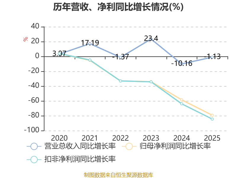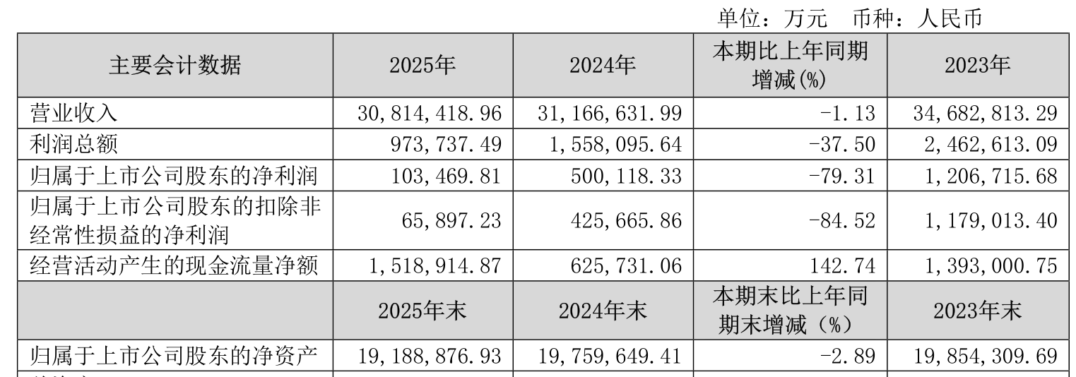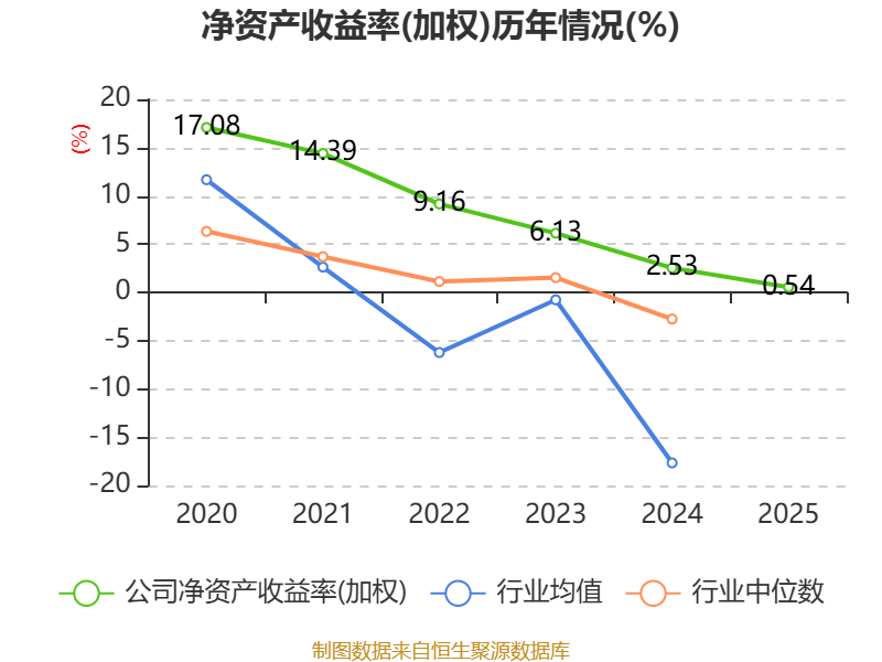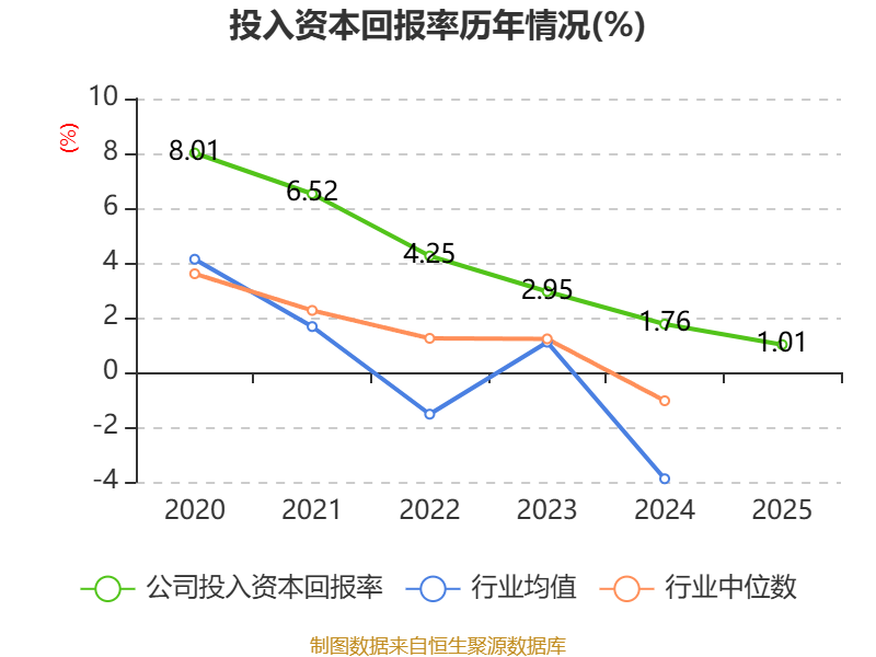数据显示,2025年公司加权平均净资产收益率为0.54%,较上年同期下降1.99个百分点。公司2025年投入资本回报率为1.01%,较上年同期下降0.75个百分点。