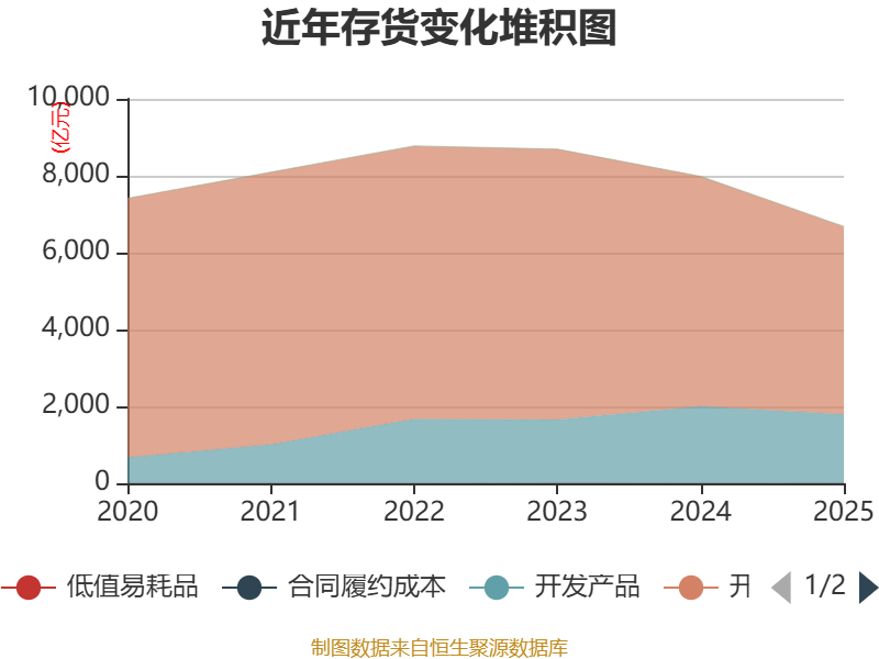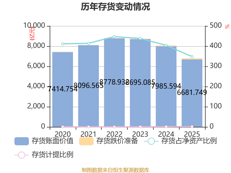 从存货变动来看,截至2025年末,公司存货账面价值为6681.75亿元,占净资产的348.21%,较上年末减少1303.84亿元。其中,存货跌价准备为113.62亿元,计提比例为1.67%。
