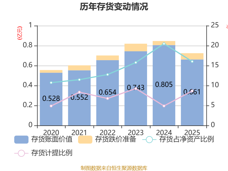 从存货变动来看,截至2025年末,公司存货账面价值为6608.82万元,占净资产的16.02%,较上年末减少1444.72万元。其中,存货跌价准备为625.8万元,计提比例为8.65%。