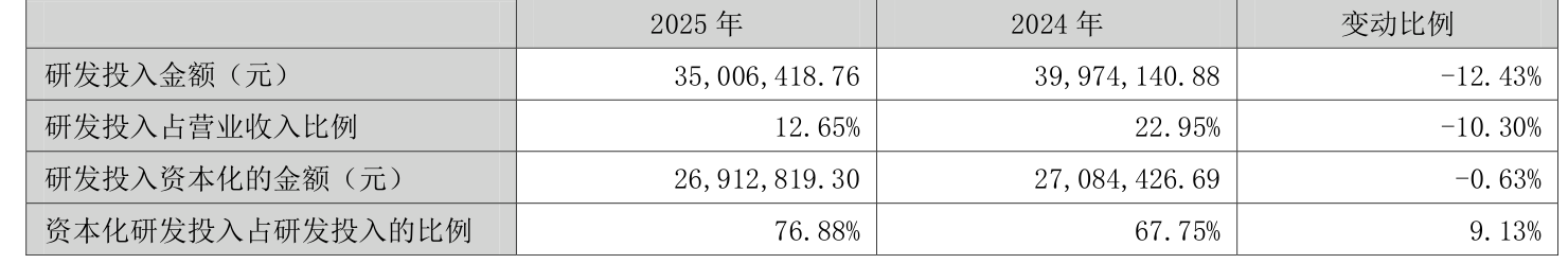 2025年全年,公司研发投入金额为3500.64万元,同比下降12.43%;研发投入占营业收入比例为12.65%,相比上年同期下降10.3个百分点。此外,公司全年研发投入资本化率为76.88%。