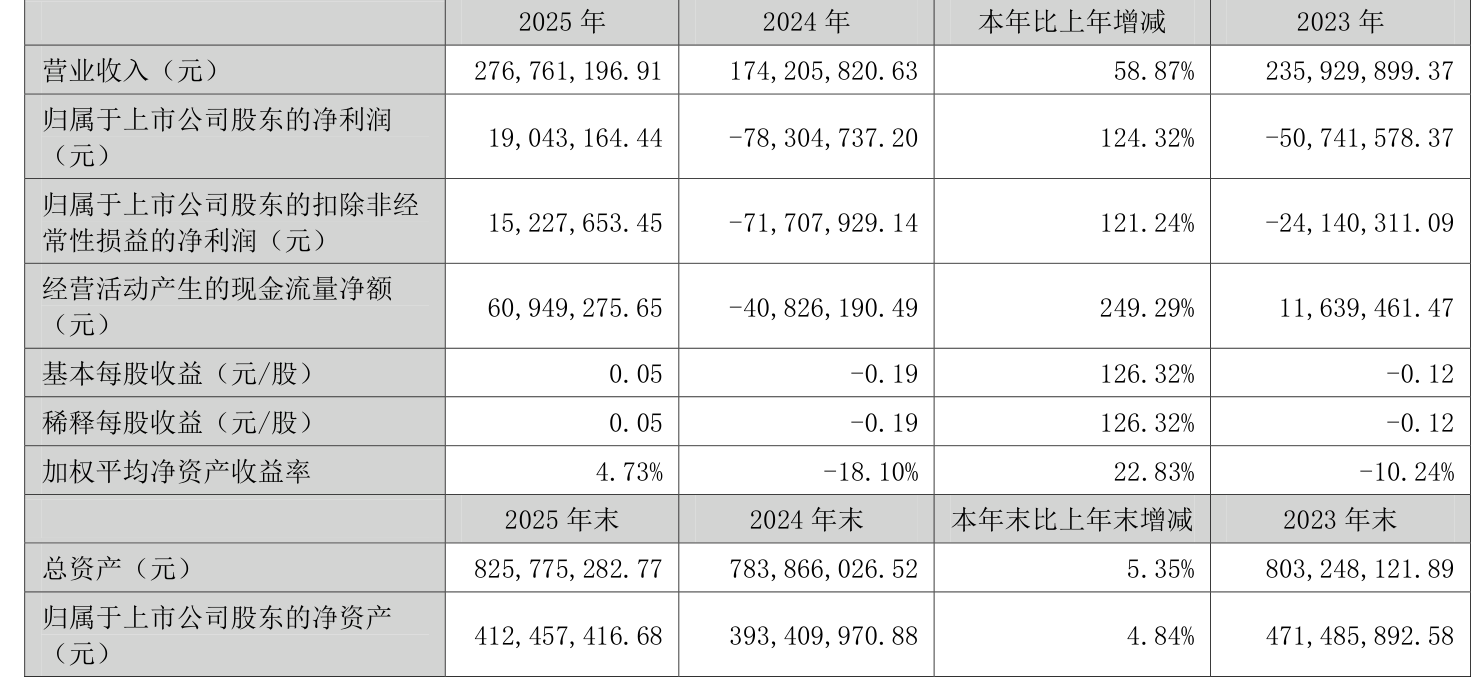 中证智能财讯 *ST双成(002693)4月18日披露2025年年度报告。2025年,公司实现营业总收入2.77亿元,同比增长58.87%;归母净利润1904.32万元,同比扭亏;扣非净利润1522.77万元,同比扭亏;经营活动产生的现金流量净额为6094.93万元,上年同期为-4082.62万元;报告期内,*ST双成基本每股收益为0.05元,加权平均净资产收益率为4.73%。