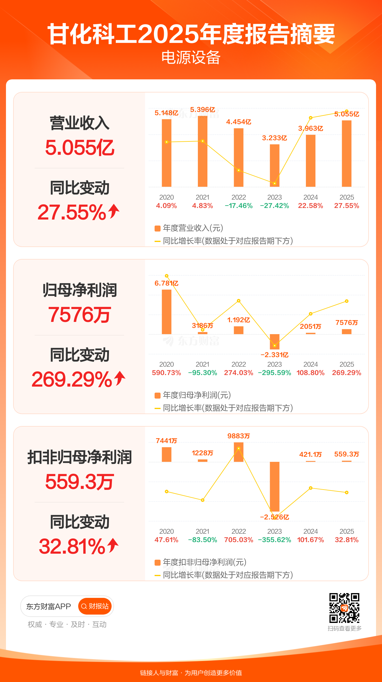 甘化科工4月20日发布2025年年报显示,公司全年实现营业收入5.05亿元,同比增长27.55%;归母净利润7575.79万元,同比增长269.29%;扣非归母净利润559.30万元,同比增长32.81%。