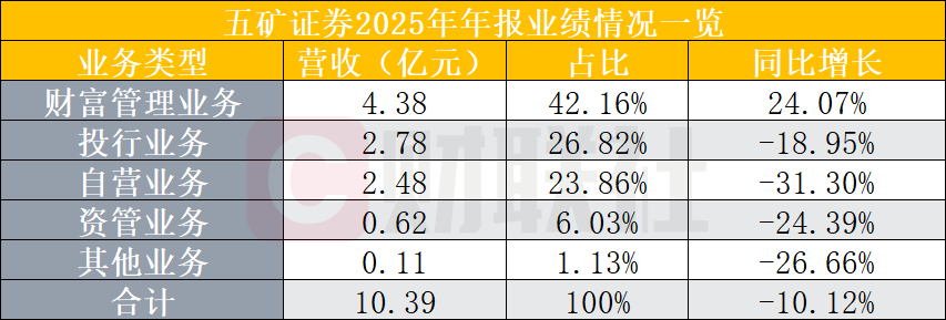 从业务收入结构来看,财富管理业务为公司第一大收入来源,同时也是全年唯一实现正向增长的业务板块,2025年该板块营收4.38亿元,同比增幅达24.07%。与之相对,投行、自营、资管及其他业务营收分别为2.78亿元、2.48亿元、0.62亿元、0.11亿元,收入规模均出现不同程度回落。