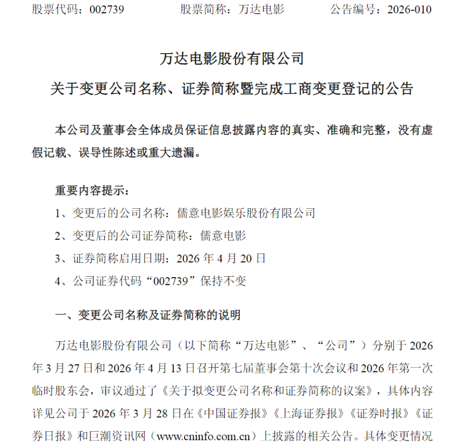 公告称,万达电影股份有限公司将变更公司名称为“儒意电影娱乐股份有限公司”,变更后的公司证券简称为“儒意电影”,于明日(4月20日)启用,证券代码“002739”保持不变。