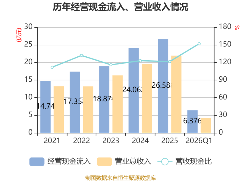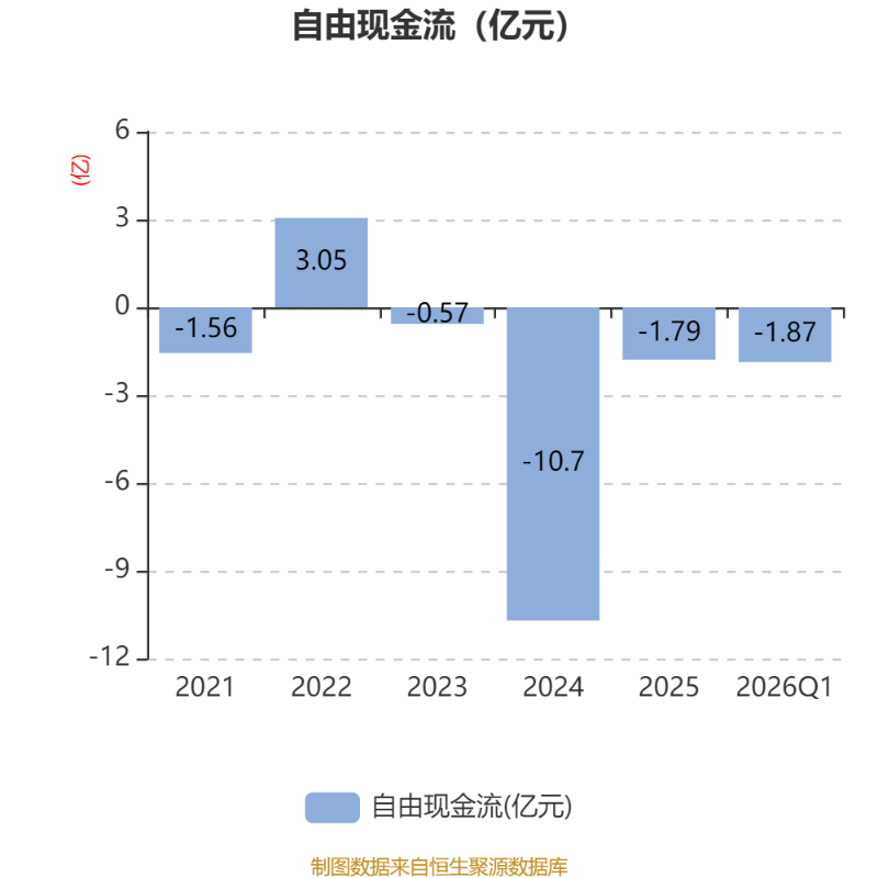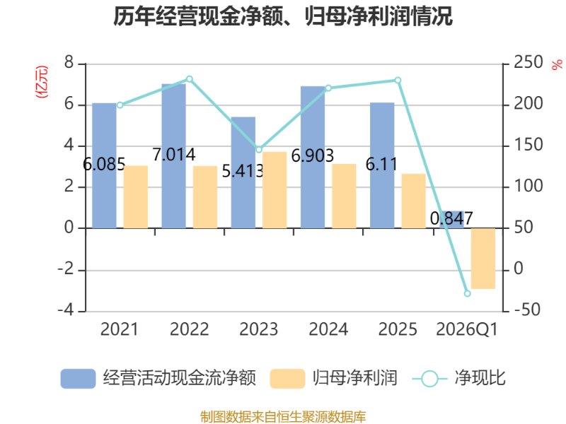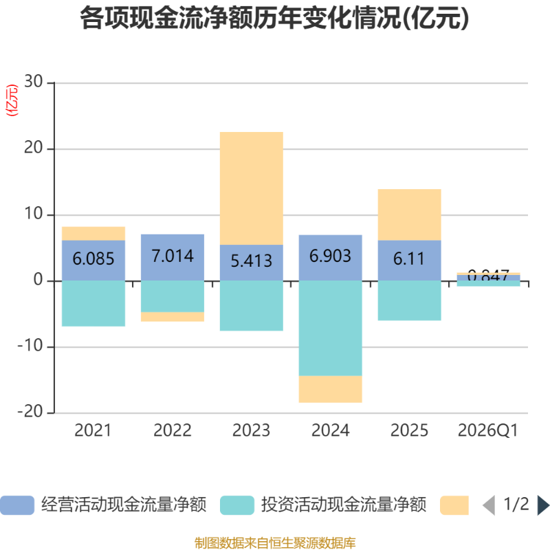 截至2026年一季度末,公司经营活动现金流净额为8471.93万元,同比增长14.12%;筹资活动现金流净额3474.81万元,同比增加1.02亿元;投资活动现金流净额-8783.54万元,上年同期为-513.5万元。