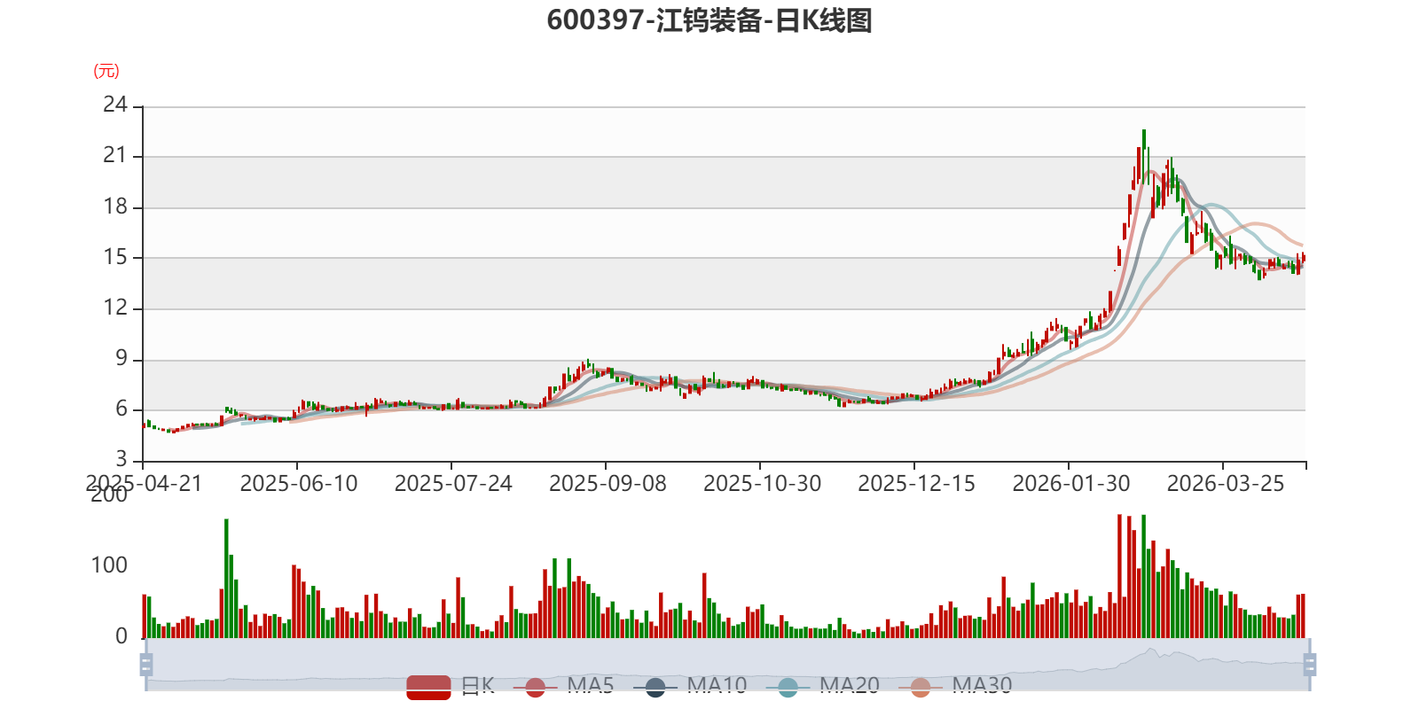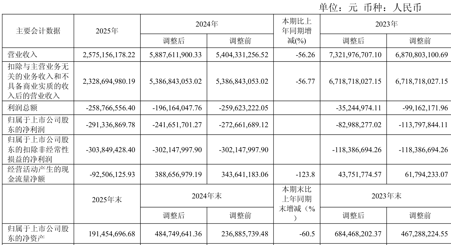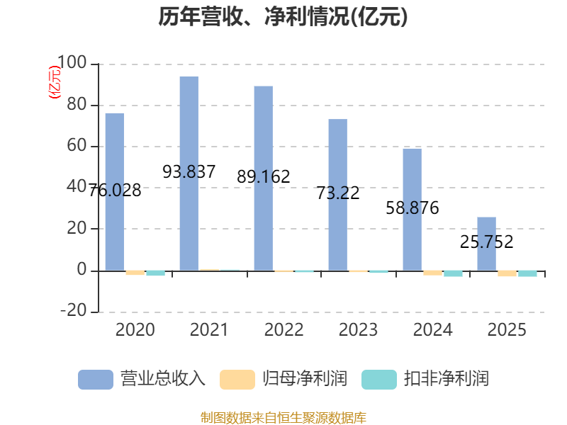 中证智能财讯江钨装备(600397)4月20日披露2025年年度报告。2025年,公司实现营业总收入25.75亿元,同比下降56.26%;归母净利润亏损2.91亿元,上年同期亏损2.42亿元;扣非净利润亏损3.04亿元,上年同期亏损3.02亿元;经营活动产生的现金流量净额为-9250.61万元,上年同期为3.89亿元;报告期内,江钨装备基本每股收益为-0.29元,加权平均净资产收益率为-88.26%。