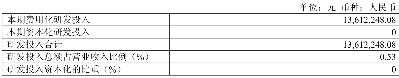 2025年全年,公司研发投入金额为1361.22万元;研发投入占营业收入比例为0.53%。此外,公司全年研发投入资本化率为0%。
