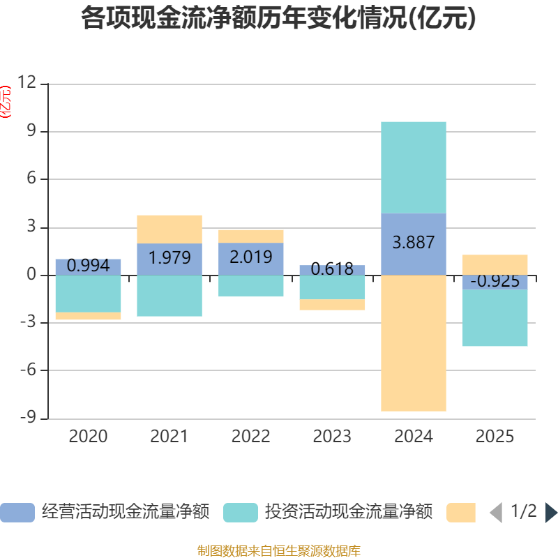 截至2025年,公司经营活动现金流净额为-9250.61万元,同比减少4.81亿元;筹资活动现金流净额1.27亿元,同比增加9.82亿元;投资活动现金流净额-3.54亿元,上年同期为5.72亿元。