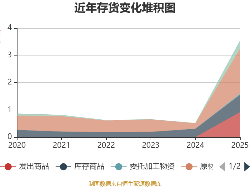 从存货变动来看,截至2025年末,公司存货账面价值为3.54亿元,占净资产的184.83%,较上年末增加3.02亿元。其中,存货跌价准备为1109.9万元,计提比例为3.04%。