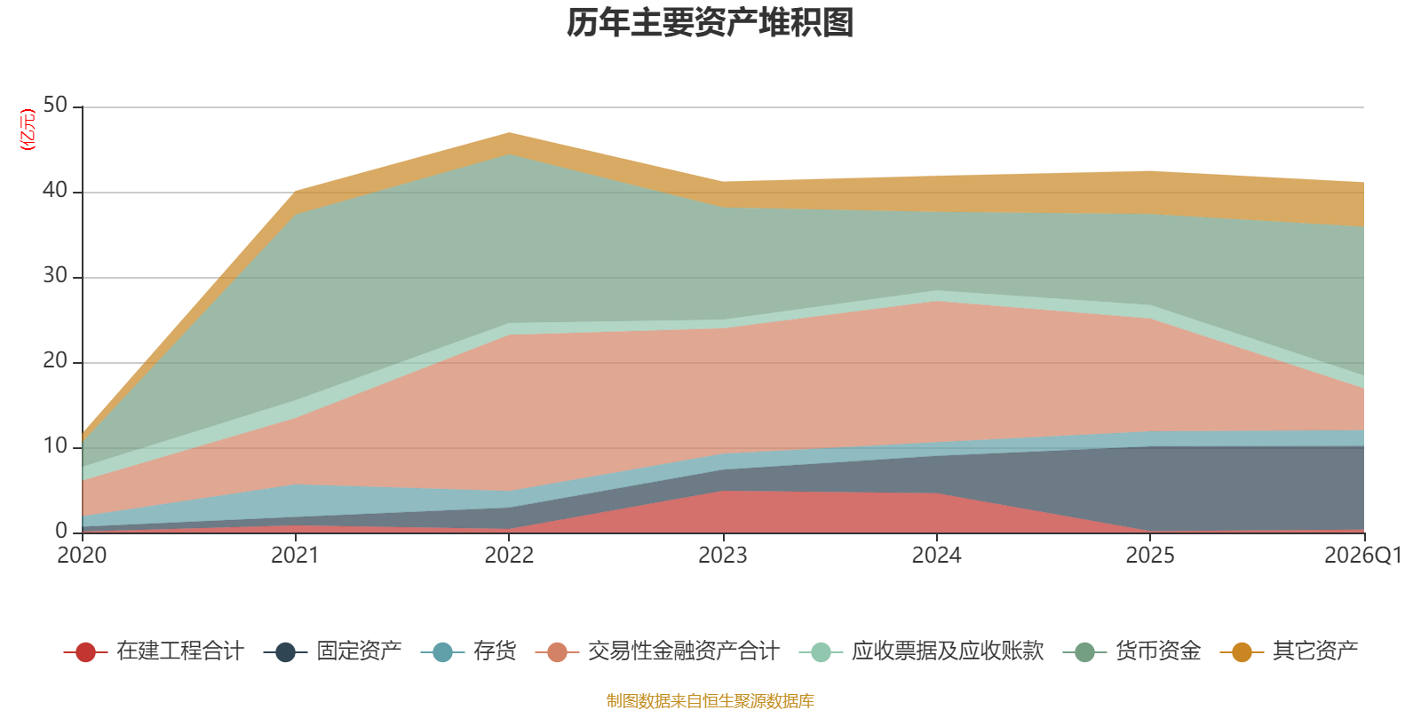 资产重大变化方面,截至2026年一季度末,公司交易性金融资产合计较上年末减少63.15%,占公司总资产比重下降19.35个百分点;货币资金较上年末增加63.78%,占公司总资产比重上升17.38个百分点;固定资产较上年末减少1.07%,占公司总资产比重上升0.5个百分点;其他流动资产较上年末增加18.23%,占公司总资产比重上升0.44个百分点。