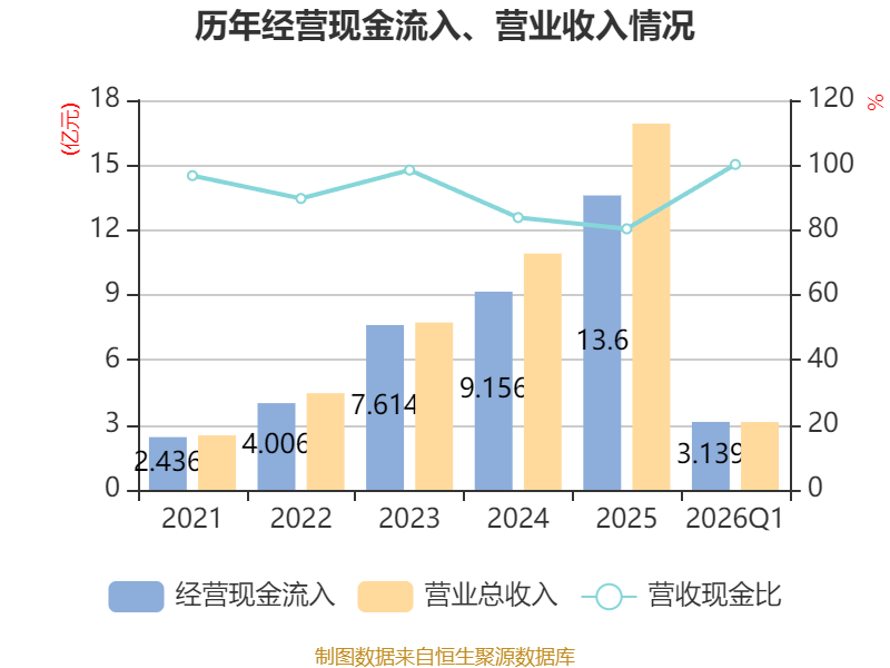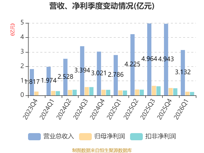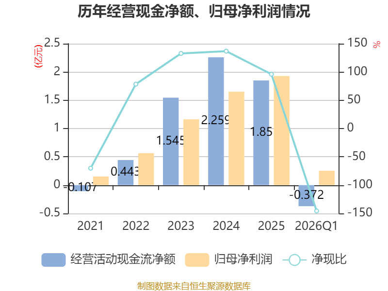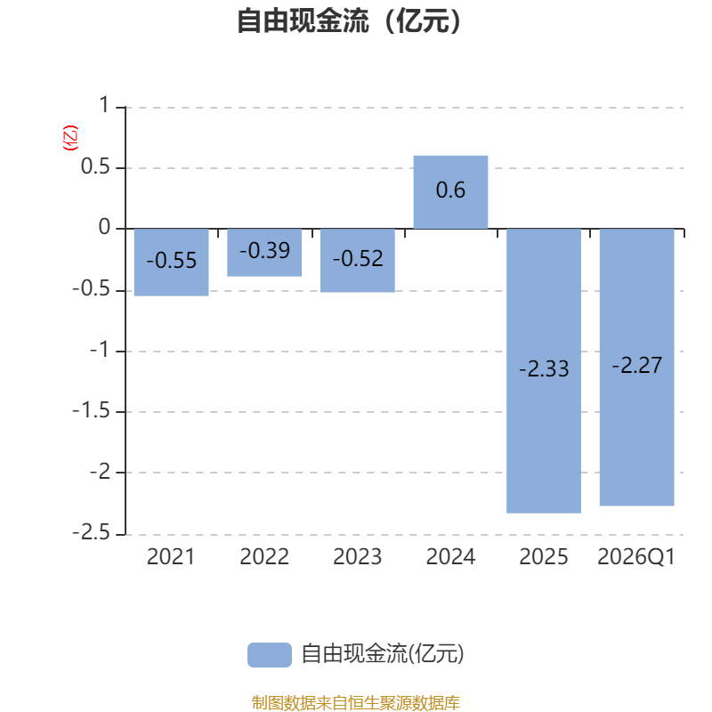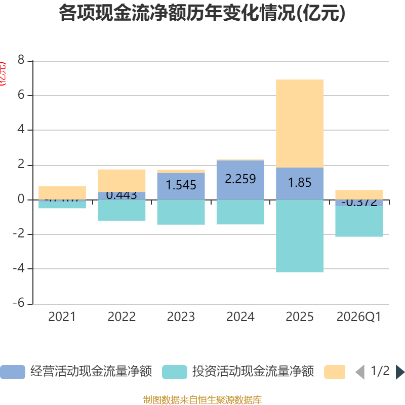截至2026年一季度末,公司经营活动现金流净额为-3716.88万元,同比增加1965.88万元;筹资活动现金流净额5488万元,同比减少5.91亿元;投资活动现金流净额-1.77亿元,上年同期为-3552.49万元。