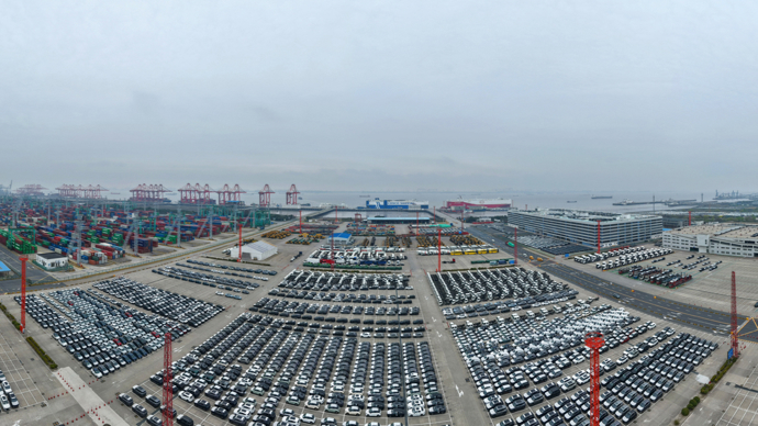 新华社照片,上海,2026年3月24日,在上海外高桥的海通汽车滚装码头上,一辆辆崭新的国产汽车源源不断地驶入停靠在码头上的汽车滚装船。