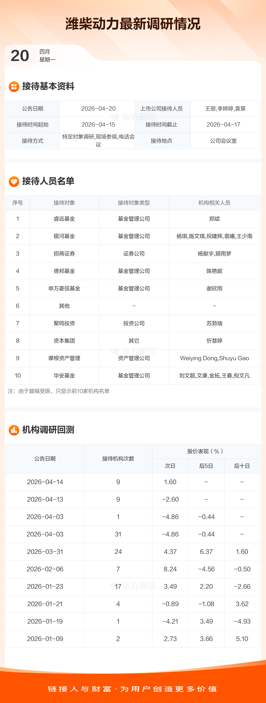 潍柴动力4月20日公告称,4月15日至4月17日接待睿远基金等14家机构调研。接待人员包括王丽,李婷婷,袁景。