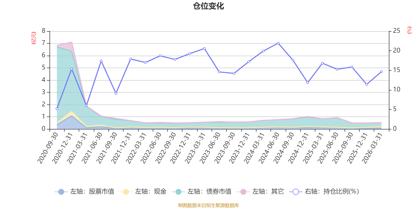 据定期报告数据统计,近三年平均股票仓位为15.95%,同类平均为19.07%。2024年上半年末基金达到21.94%的最高仓位,2020年三季度末最低,为5.23%。