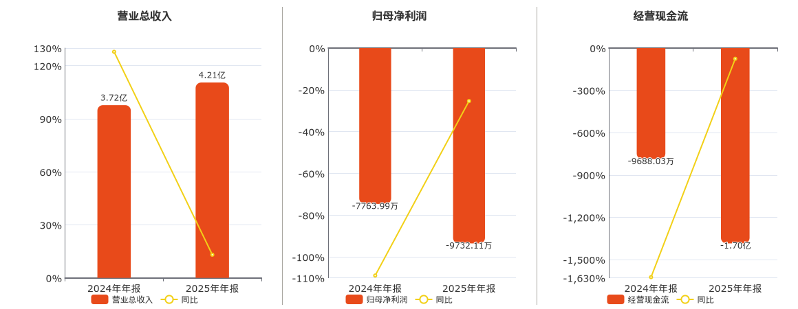 公司营业总收入为4.21亿元,在已披露的同业公司中排名第33。归母净利润为-9732.11万元,在已披露的同业公司中排名第29,较去年同报告期归母净利润减少1968.12万元。经营活动现金净流入为-1.70亿元,在已披露的同业公司中排名第36,较去年同报告期经营活动现金净流入减少7360.54万元。