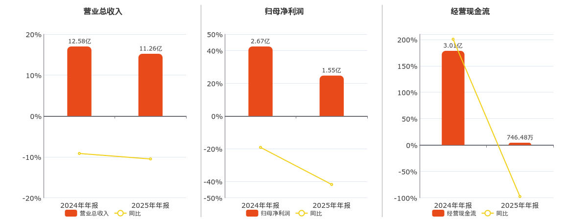 公司营业总收入为11.26亿元,较去年同报告期营业总收入减少1.32亿元,同比较去年同期下降10.50%。归母净利润为1.55亿元,较去年同报告期归母净利润减少1.12亿元,同比较去年同期下降41.84%。经营活动现金净流入为746.48万元,较去年同报告期经营活动现金净流入减少2.93亿元,同比较去年同期下降97.52%。