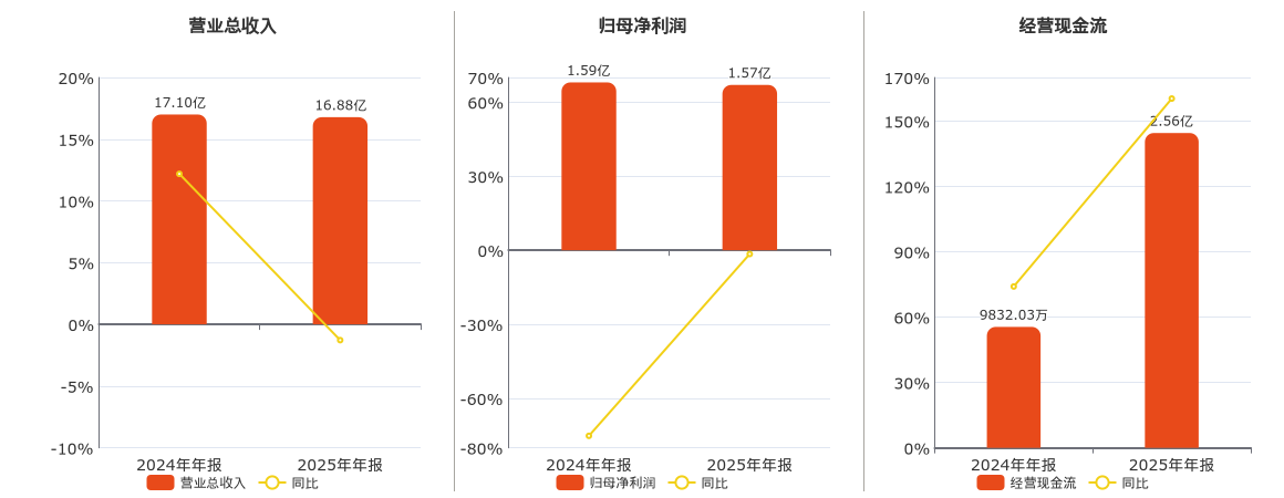 公司营业总收入为16.88亿元,在已披露的同业公司中排名第13,较去年同报告期营业总收入减少2194.41万元,同比较去年同期下降1.28%。归母净利润为1.57亿元,在已披露的同业公司中排名第10,较去年同报告期归母净利润减少238.81万元,同比较去年同期下降1.50%。经营活动现金净流入为2.56亿元。