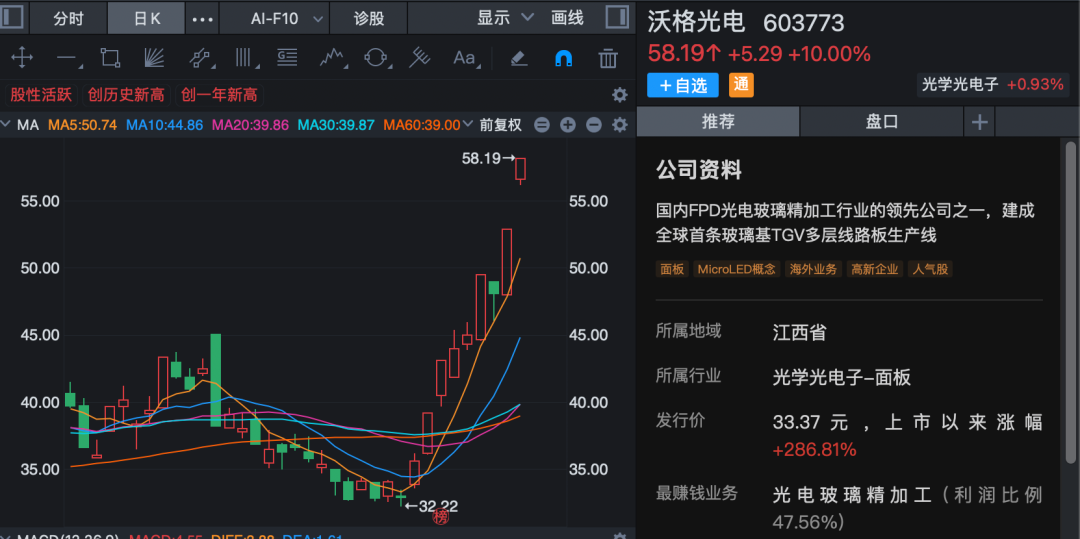 消费电子早间整体走强,折叠屏方向最为活跃,板块指数放量创历史新高。彩虹股份开盘仅约1分钟直线涨停,近8个交易日4度涨停;沃格光电约2分钟涨停,8日5板,乔锋智能、西部材料等涨停或涨超10%。