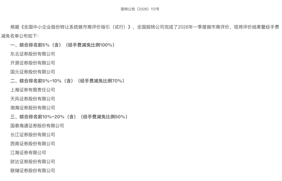 据悉,此次评价对象为2026年一季度开展做市业务的券商。根据《全国中小企业股份转让系统做市商评价指引(试行)》规定,12家做市商获得了做市交易经手费减免资格。