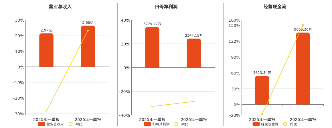 公司营业总收入为3.66亿元。归母净利润为2344.15万元,较去年同报告期归母净利润减少935.32万元,同比较去年同期下降28.52%。经营活动现金净流入为9069.30万元。