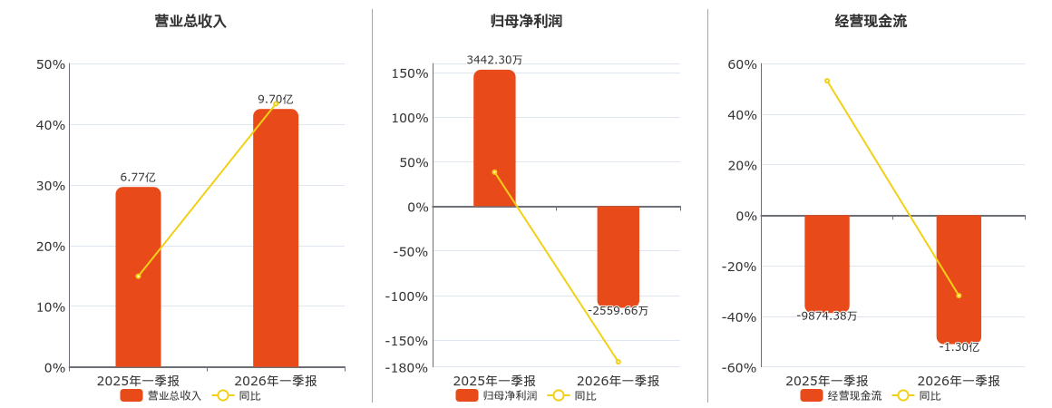 公司营业总收入为9.70亿元。归母净利润为-2559.66万元,较去年同报告期归母净利润减少6001.96万元,同比较去年同期下降174.36%。经营活动现金净流入为-1.30亿元,较去年同报告期经营活动现金净流入减少3141.63万元。