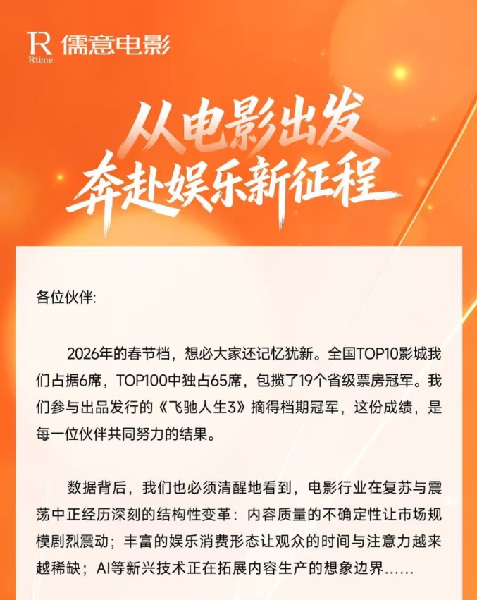 儒意电影董事长兼总裁陈祉希还发布了一封全员信,宣布“万达电影股份有限公司”正式更名为“儒意电影电影娱乐股份有限公司”。其同时表示,儒意电影与“儒意系”的协同不止于“内容+渠道”,儒意电影将依托全国700多家直营影城和儒意系丰富的IP储备,打造“超级场景”与“超级IP”,为用户提供优质的线上线下娱乐消费体验,从一家聚焦内容制作、发行与放映的传统电影公司,努力进化成全球用户至爱的文化娱乐品牌。