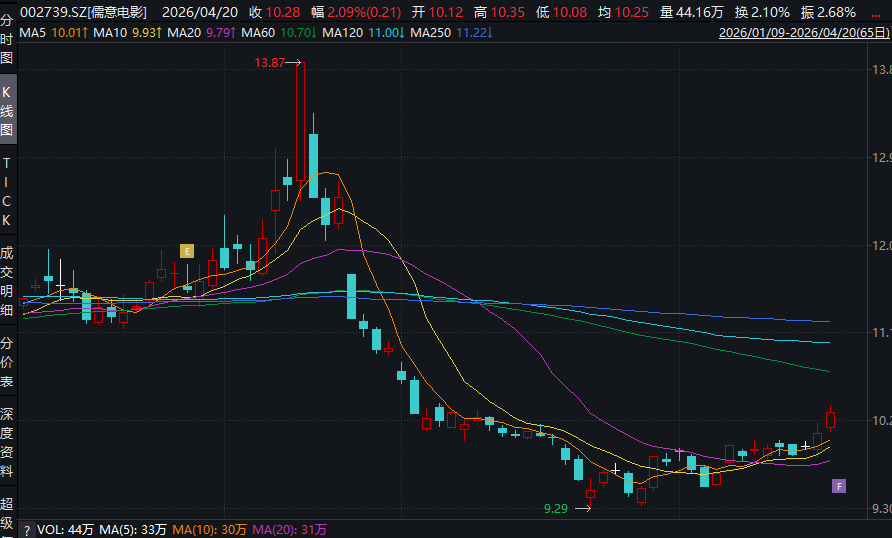 4月20日开盘,儒意电影股价上涨,截至发稿,股价涨幅为2.09%,报10.28元/股,总市值为217亿元。