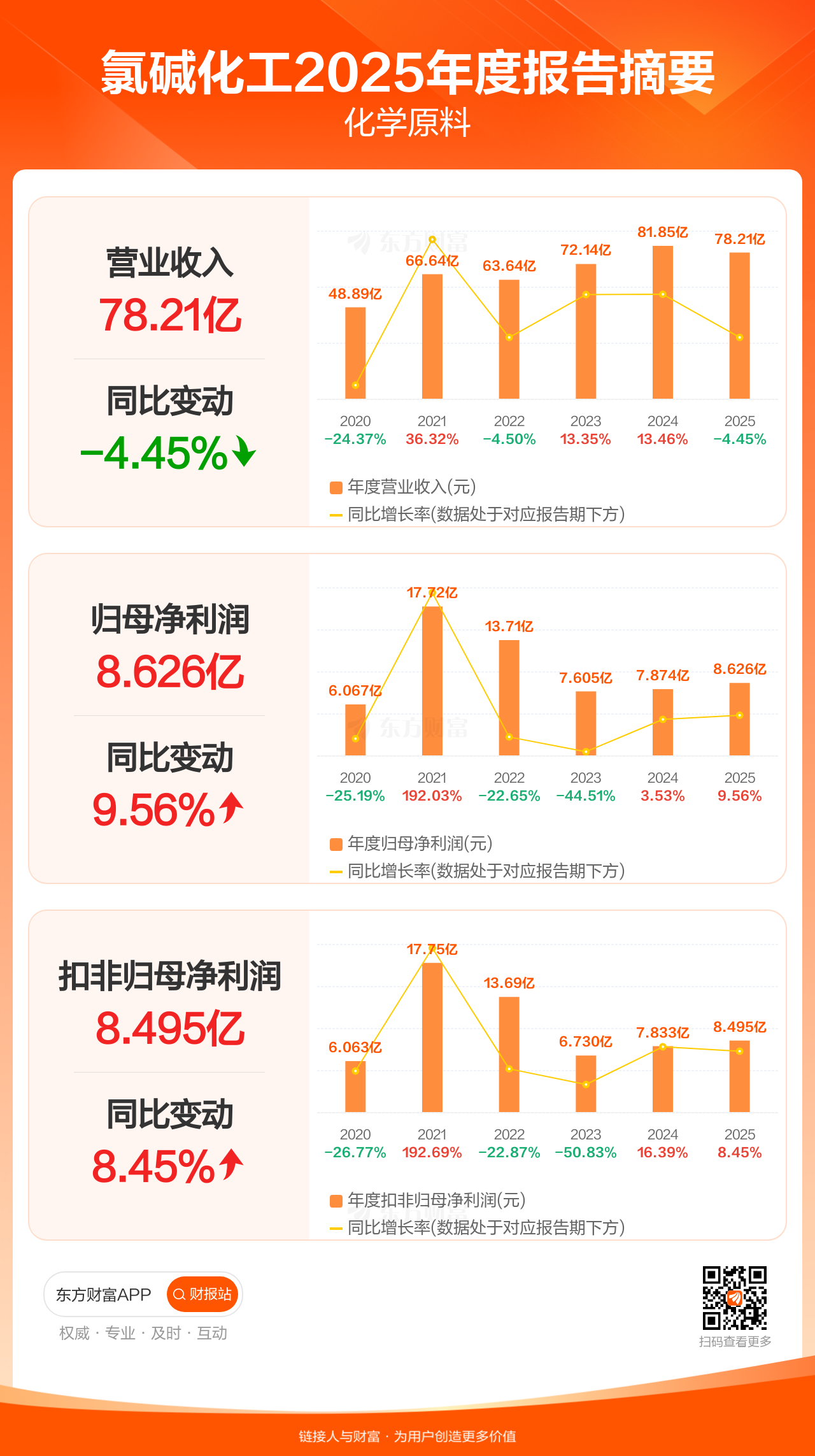 氯碱化工4月21日发布2025年年报显示,公司全年实现营业收入78.21亿元,同比下滑4.45%;归母净利润8.63亿元,同比增长9.56%;扣非归母净利润8.49亿元,同比增长8.45%。