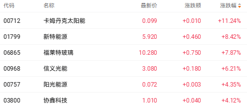 截至收盘,新特能源(01799.HK)涨8.42%,福莱特玻璃(06855.HK)涨7.87%,信义光能(00968.HK)涨6.21%。