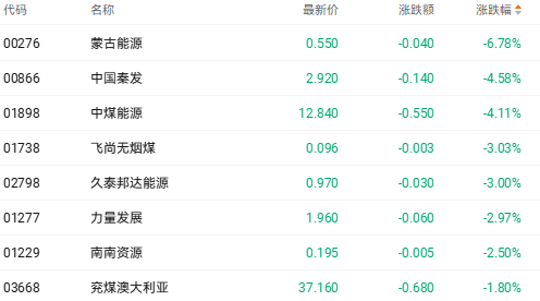 值得注意的是,作为替代能源的煤炭板块同样表现不佳。截至收盘,蒙古能源(00276.HK)跌6.78%,中国秦发(00866.HK)跌4.58%,中煤能源(01898.HK)跌4.11%。