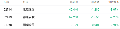 截至收盘,牧原股份(02714.HK)跌3.07%,德康农牧(02419.HK)跌2.25%,雨润食品(01068.HK)跌0.91%。