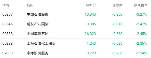 截至收盘,中国石油股份(00857.HK)跌3.27%,中国海洋石油(00883.HK)跌2.45%,中海油田服务(02883.HK)跌2.24%。