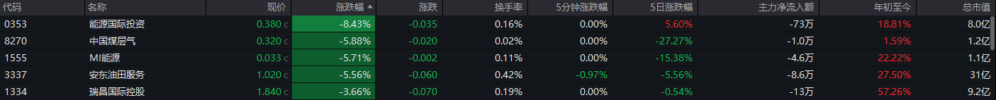 石油石化板块下跌,能源国际投资跌超8%,中国煤层气、MI能源跌超5%。