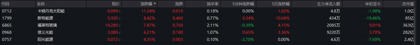 光伏太阳能股上涨,卡姆丹克太阳能涨超11%,新特能源涨超8%,福莱特玻璃涨超7%;
