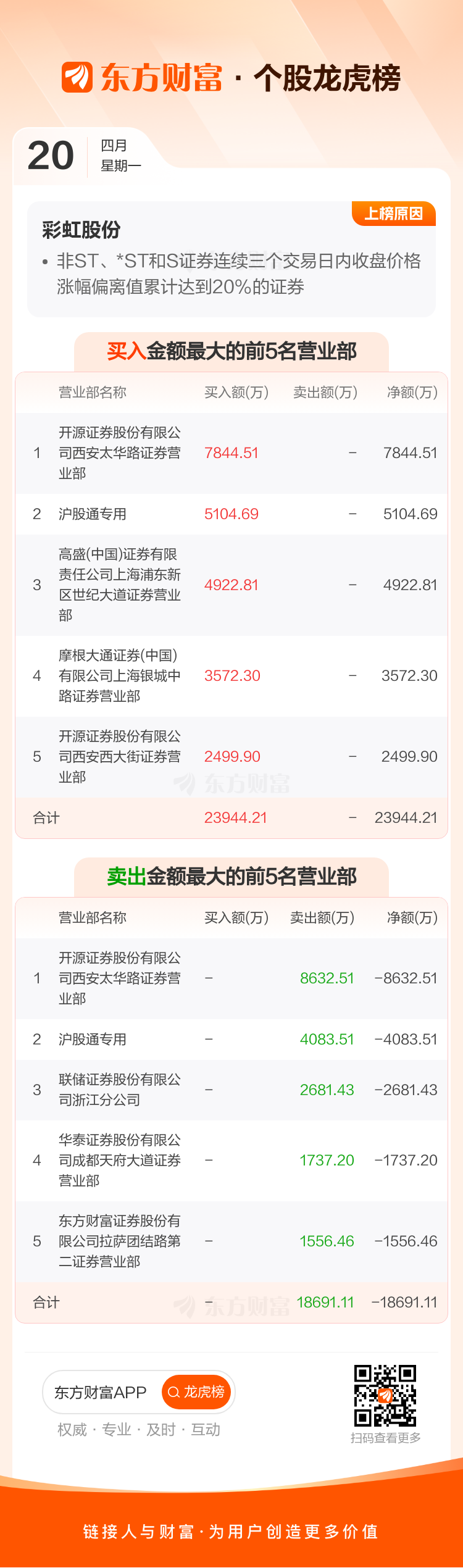 交易所2026年4月20日公布的交易公开信息显示,彩虹股份因成为非ST、*ST和S证券连续三个交易日内收盘价格涨幅偏离值累计达到20%的证券上榜。彩虹股份当日收报8.57元,涨跌幅10.01%,换手率3.09%,成交额9.35亿。异常期间4月17日至4月20日,期间涨幅21.05%,累计偏离值20.39%,区间成交额18.42亿。