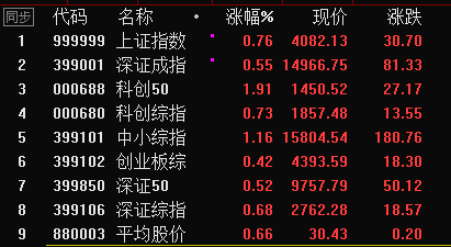 4月20日,A股延续升势。截至终盘,上证指数收报4082.13点,上涨30.70点,涨幅0.76%;深证综指收报2762.28点,上涨18.57点,涨幅0.68%;科创综指上涨0.73%;中小综指上涨1.16%;创业板综指上涨0.42%。A股成交金额合计26065.23亿元,比上周五放大6%。