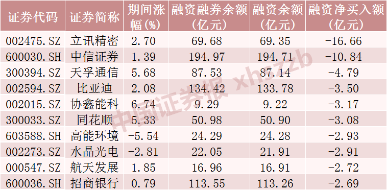 上周融资客对50只股票减仓金额超1亿元,减仓金额居前的10只股票分别为:立讯精密、中信证券、天孚通信、比亚迪、协鑫能科、同花顺、高能环境、水晶光电、航天发展、招商银行,分别净卖出16.66亿元、10.84亿元、4.79亿元、3.50亿元、3.17亿元、3.08亿元、2.93亿元、2.91亿元、2.72亿元、2.69亿元。从市场表现上来看,这10只股票上周多数上涨,涨幅最大的协鑫能科涨逾6%。