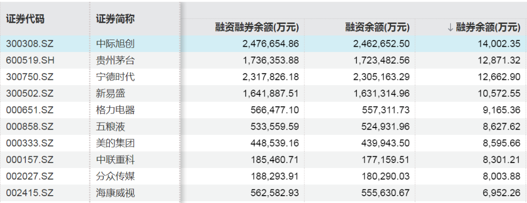 Wind数据显示,截至4月17日,A股市场融券余额居前的股票分别为中际旭创、贵州茅台、宁德时代,融券余额分别为1.40亿元、1.29亿元、1.27亿元。此外,新易盛的融券余额也超过1亿元。