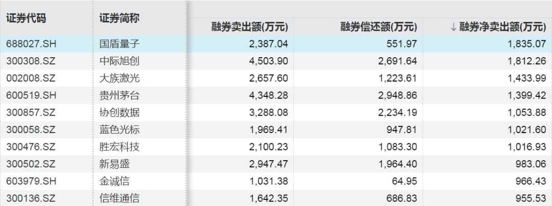 上周融券净卖出金额居前的股票为国盾量子、中际旭创、大族激光,分别净卖出1835.07万元、1812.26万元、1433.99万元。