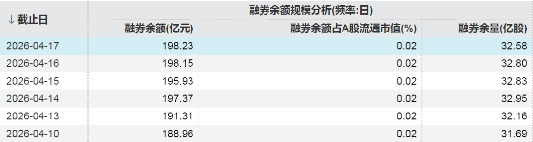 Wind数据显示,截至4月17日,A股市场融券余额为198.23亿元,融券余量为32.58亿股。