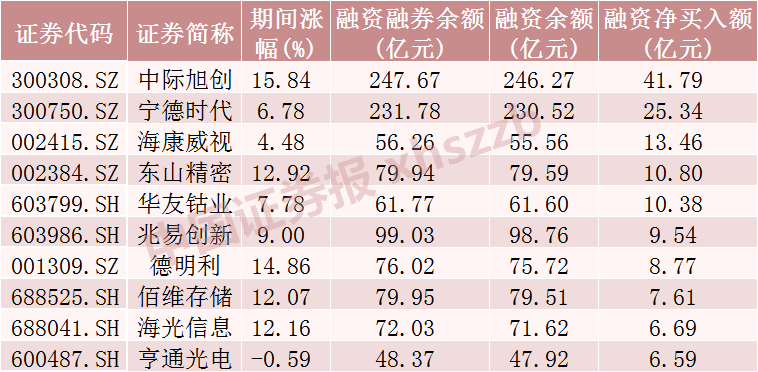 从个股情况来看,上周融资客对207只股票加仓金额超1亿元,加仓金额居前的10只股票分别为:中际旭创、宁德时代、海康威视、东山精密、华友钴业、兆易创新、德明利、佰维存储、海光信息、亨通光电,分别净买入41.79亿元、25.34亿元、13.46亿元、10.80亿元、10.38亿元、9.54亿元、8.77亿元、7.61亿元、6.69亿元、6.59亿元。从市场表现上看,上周融资客加仓金额居前十的股票中,除亨通光电下跌0.59%外,其他股票均上涨,涨幅最大的中际旭创涨逾15%。