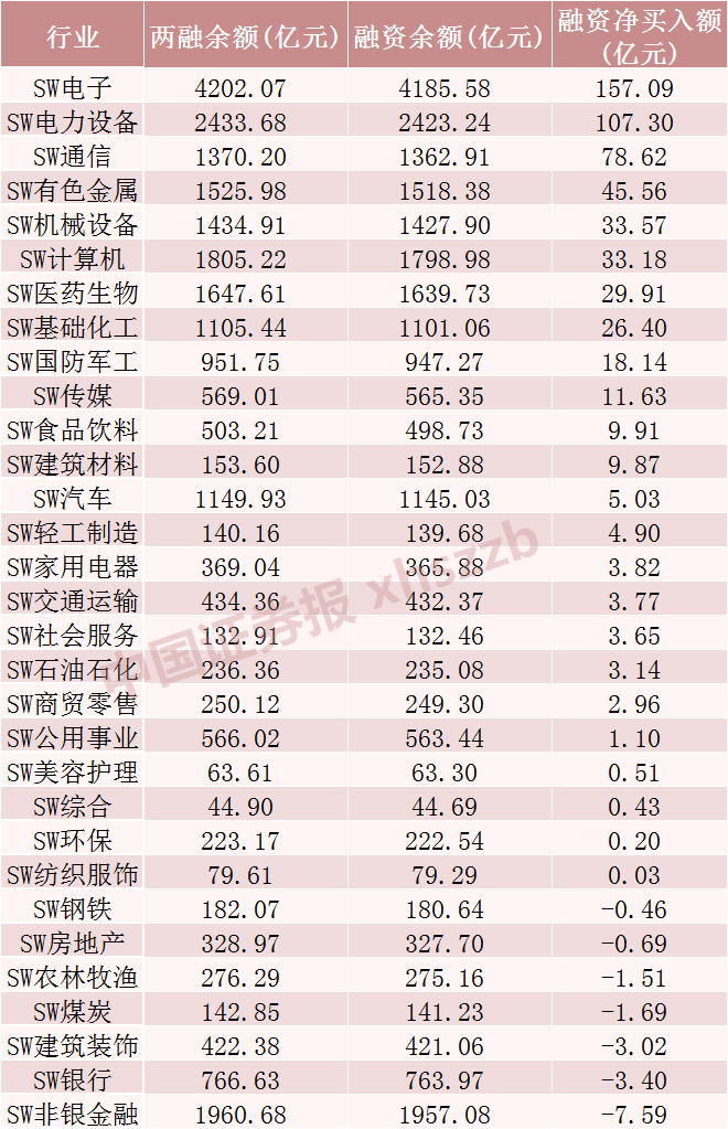 从行业情况来看,上周申万一级31个行业中有24个行业融资余额增加,电子、电力设备、通信行业融资净买入金额居前,分别为157.09亿元、107.30亿元、78.62亿元。在出现融资净卖出的7个行业中,非银金融、银行、建筑装饰行业融资净卖出金额居前,分别为7.59亿元、3.40亿元、3.02亿元。