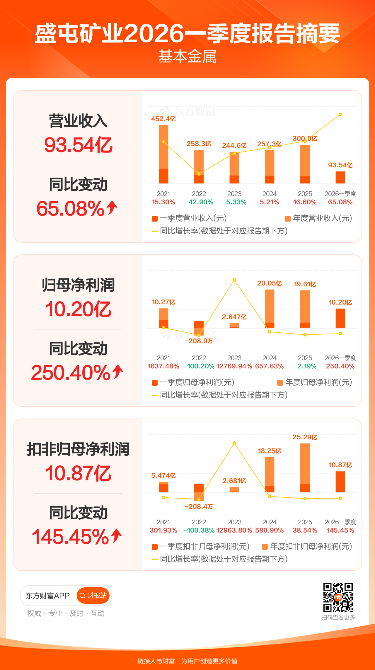 盛屯矿业4月21日发布2026年一季报显示,公司一季度实现营业收入93.54亿元,同比增长65.08%;归母净利润10.20亿元,同比增长250.40%;扣非归母净利润10.87亿元,同比增长145.45%。