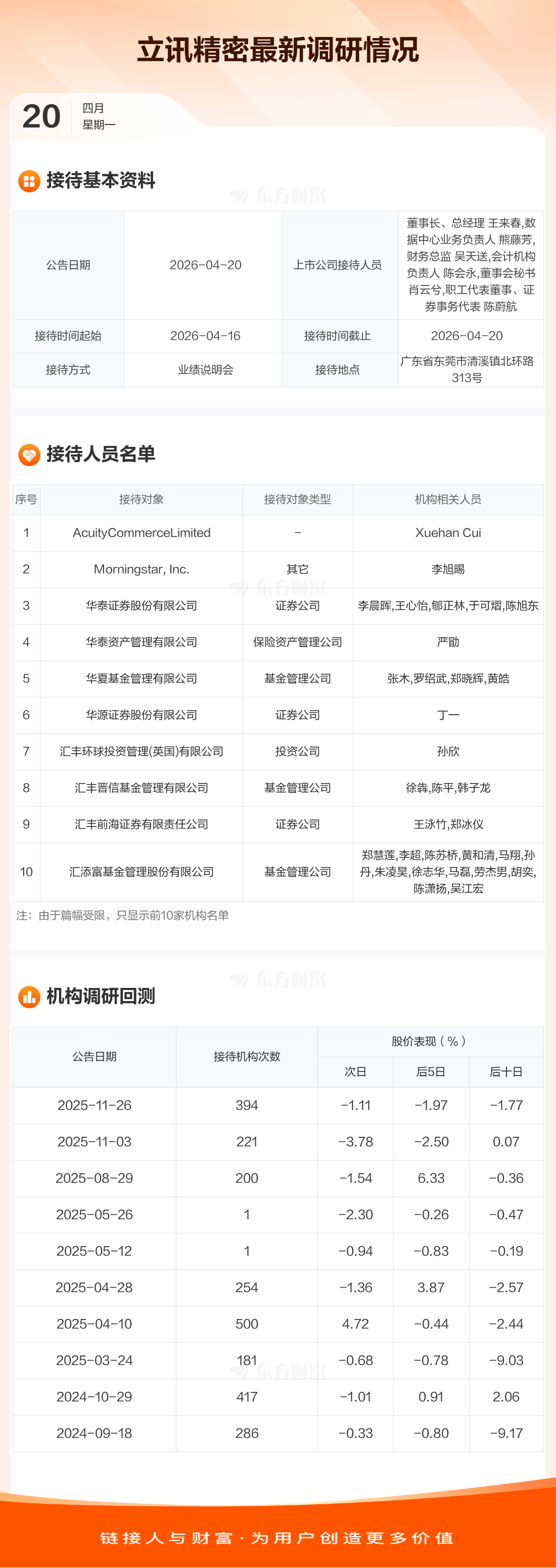 立讯精密4月20日公告称,4月16日至4月20日接待AcuityCommerceLimited等279家机构调研。接待人员包括董事长、总经理 王来春,数据中心业务负责人 熊藤芳,财务总监 吴天送,会计机构负责人 陈会永,董事会秘书 肖云兮,职工代表董事、证券事务代表 陈蔚航。