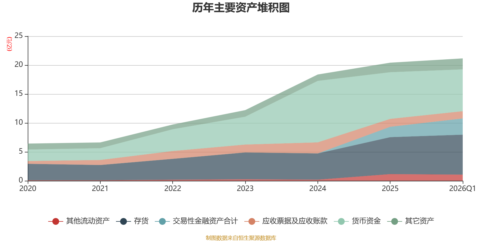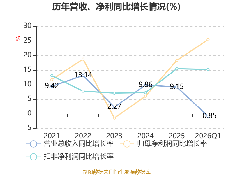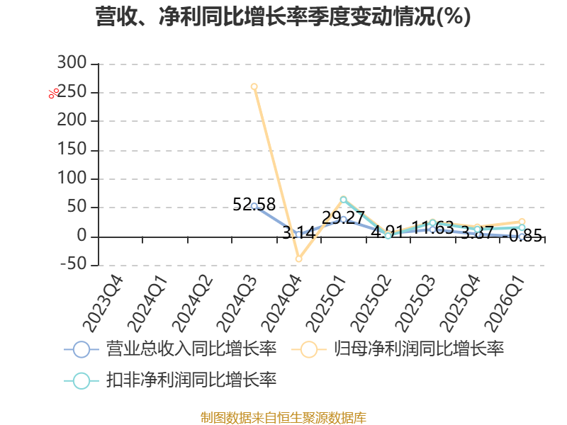 资产重大变化方面,截至2026年一季度末,公司货币资金较上年末减少10.32%,占公司总资产比重下降5.32个百分点;交易性金融资产合计较上年末增加55.6%,占公司总资产比重上升4.43个百分点;存货较上年末增加8.31%,占公司总资产比重上升1.42个百分点;应收票据及应收账款较上年末减少7.58%,占公司总资产比重下降0.72个百分点。